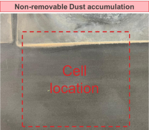 After more than one year of monitoring, V-diamond and Heritage tiles showed a higher performance loss rate (PLR), indicating that products with colors or a satinated glass were more prone to degradation. For the satinated product, it has been observed that non-removable dust accumulated on the structured glass below the overlap location. This results in prohibiting the light from reaching the cell, thus leading to a performance loss over time.